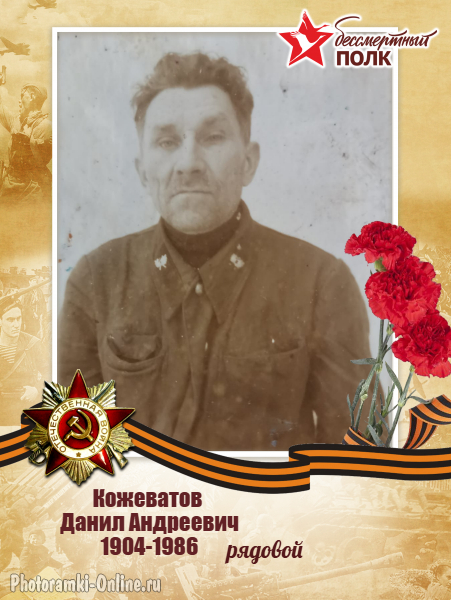 Историей о своем герое поделился председатель суда Александр Ковальчук. Кожеватов Данил Андреевич 1904-1986 Кожеватов Данил Андреевич, родился 30 декабря 1904 года в с. Паркино Сурского района Ульяновской области. Дед был призван по мобилизации 13.10.1941 года Астрадамовским РВК Ульяновской области. 14 октября 1941 года зачислен в 1035-й стрелковый полк в должности стрелка. Участвовал в боях до 06 февраля 1943 года. В 1943 году получил серьезные осколочные ранения, долгое время находился на лечении в военных госпиталях, после чего был уволен по ранению. Всю жизнь прожил с осколком, который опасно было удалять. Имеет воинское звание: рядовой. Умер 06 июля 1986 года, похоронен на кладбище в с. Паркино Сурского района Ульяновской области. Кожеватов Д.А. был награжден Орденом Отечественной войны II степени.
