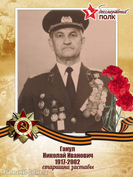| Мы продолжаем делиться историями о героях - участниках тех событий, которые происходили в нашей стране в годы Великой Отечественной войны 1941-1945 гг. Сегодня своей историей делится начальник общего отдела Наталья Ганул. родился 4 июня 1917 года в г. Енакиево Екатеринославской губернии Российской Империи (ныне Донецкой области Украины). Молдаванин. В 1934-37 гг. учился в металлургическом техникуме г. Енакиево, затем в г. Красный Сулин работал техником на металлургическом заводе и учителем свиносовхоза «Ударник».В ряды Рабоче-Крестьянской Красной армии призван 1 января 1938 года Новошахтинским ГВК Ростовской области. Военную присягу принял 5 сентября 1938 г. Срочную службу начал в 37-м пограничном отряде Грузинского пограничного округа, г. Батуми. В марте 1941 года переведён в 23-й Каменец-Подольский Краснознамённый пограничный отряд НКВД СССР. Участник Великой Отечественной войны. В первый же день боевых действий отражал вторгшегося противника на границе с Румынией на реке Прут (посёлок Липканы) в составе 9-й заставы 23-го Краснознамённого погранотряда НКВД. В период с 22 по 26 июня 1941 года подразделения погранотряда уничтожили свыше 600 гитлеровцев, сбили 2 самолёта, уничтожили 2 артиллерийских орудия, три пулемёта, потопили 10 десантных лодок. 2 июля 1941 года Отряд по приказу сдал линию охраны госграницы частям Красной Армии и приступил к охране тыла войск Южного фронта. В этот период Ганул Н.И. сражался с фашистами, находясь на должности командира отделения заставы. В сентябре 1941 года вступил в ряды ВКП(б). В последующем находился на должности старшины заставы 23 пограничного полка НКВД сначала в г. Бахчисарай Крымской АССР, затем 23-го дважды Краснознамённого пограничного отряда НКВД, гг. Кретинга-Клайпеда Литовской ССР. После окончания Отечественной войны продолжил службу в пограничных войсках СССР. Служил в должности секретаря политотдела 23-го дважды Краснознамённого пограничного отряда МВД СССР. В 1946-1947 гг. был курсантом Военно-политического училища МВД СССР, г. Харьков Украинской ССР. С 1947 по 1950 год секретарь партийного бюро комендатуры 23-го дважды Краснознамённого пограничного отряда МВД СССР, г. Клайпеда Литовской ССР, затем секретарь партийного бюро комендатуры 95-го ордена Ленина пограничного отряда МГБ СССР, г. Правдинск Калининградской области. В 1951 году назначен заместителем коменданта по политической части 94-го пограничного отряда МГБ СССР, г. Мариямполе Литовской ССР. В 1953 году стал заместителем коменданта по политической части 24-го Кёнигсбергского ордена Красной Звезды пограничного отряда войск МВД СССР. В 1953-1954 годах слушатель пограничной школы усовершенствования политического состава МВД, г. Харьков, Украинская ССР. С 1954 года служил заместителем коменданта по политической части 1- го Краснознамённого пограничного отряда войск МВД СССР, г. Сортавала Карело-Финской ССР, затем инструктором по пропаганде 15-й отдельной авиаэскадрильи пограничных войск, г. Петрозаводск, Карельская АССР. В 1958 году назначен старшим инструктором политического отдела 4-го пограничного отряда Северного пограничного округа, г. Архангельск. Приказом КГБ СССР №380 от 7 сентября 1958 г. присвоено звание «майор». С 1960 по 1962 год находился на должности старшего инструктора политического отдела 1-го Краснознамённого пограничного отряда КГБ СССР, г. Сортавала, Каре