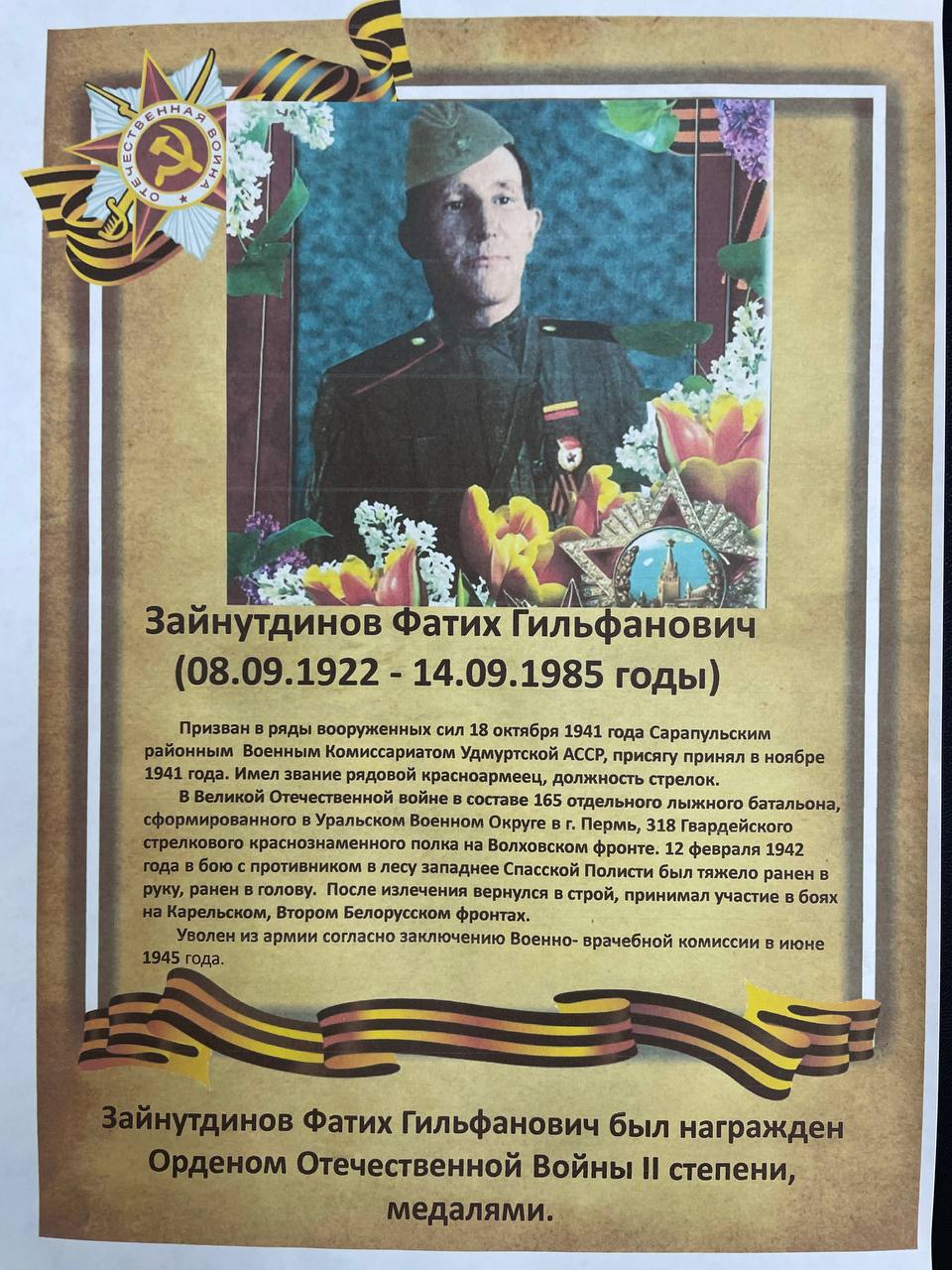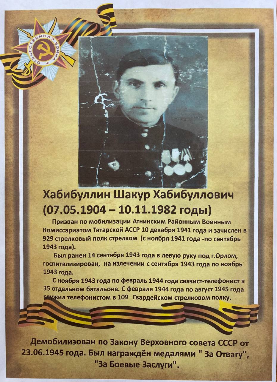 | Сегодня своей историей о своих героях, участниках тех страшных событий 1941-1945гг. делится мировой судья судебного участка №3 по Ново-Савиновскому районному району - Раян Зайнутдинов. Истории о его деде и прадеде. ![]() ![]() |