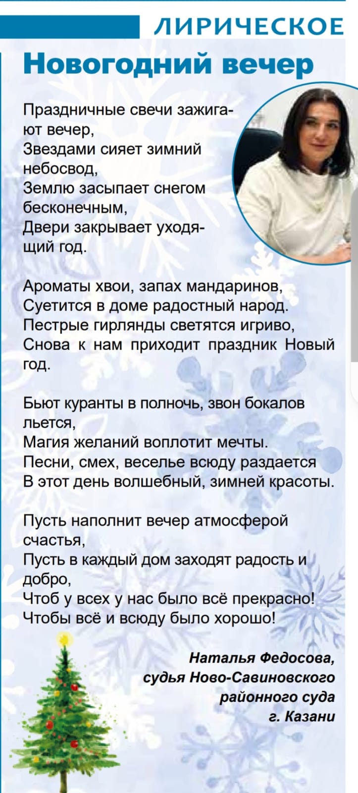 В новогоднем выпуске газеты «Суд да Дело в Татарстане» опубликовано лирическое стихотворение «Новогодний вечер» собственного сочинения нашего коллеги - судьи Натальи Федосовой. И очень хочется, чтобы последние строчки этого стихотворения обязательно воплотились в Новом году. Пусть обязательно у всех у нас в 2025 году будет все хорошо! Пресс-служба суда.