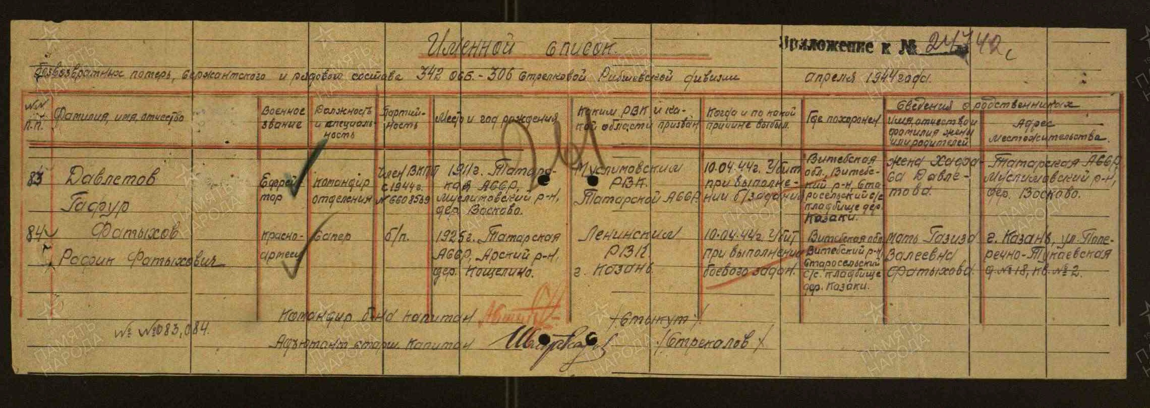 ![]() Баязитов Закизян Багаутдинович Баязитов Закизян Багаутдинович, 1923 года рождения, был призван на фронт 12 февраля 1942 года и зачислен курсантом в Ленинградское пехотное училище. С мая 1942 года воевал в составе 18 гвардейского стрелкового полка. В одном из боев был тяжело ранен, после 3 месяцев лечения в госпитале был комиссован по ранению. Несмотря на ранение, снова попросился на фронт, на защиту своей Родины. В декабре 1943 года был призван и зачислен в 137 запасной стрелковый полк. Демобилизовался в ноябре 1945 года. Имеет награды: орден Отечественной войны 1 степени и медали, а также награждён медалью «За победу над Японией». ![]() Булатов Фатых Гарипович Булатов Фатых Гарипович родился 20 марта 1902 года в деревне Нижний Сухояш ныне Азнакаевского района Республики Татарстан. Военачальник, генерал-майор Советской Армии. В 1923 году поступает в Объединенную Татаро-башкирскую военную школу им.ТатЦИКа в Казани. Закончив военную школу, служит в Первом татарском полку командиром взвода, затем работает Аргаяшском райвоенкомате Башкирии. В 1932 году возвращается в Татарию и до 1937 года служит в Казани командиром полковой школы. Затем в Саратове командует батальоном. В 1939 году формирует полк и отправляется в Монголию, откуда осенью того же года переводится в Бурятию. С 1941 года и до конца войны на фронте, командует полком, а затем дивизией. После войны в 1947 году генерал Булатов Ф.Г. был избран депутатом Верховного Совета РСФСР. В 1948 году после окончания Высшей военной академии им.К.Е. Ворошилова служил на Дальнем Востоке. В 1952-1956 годах нес службу в Белоруссии. С 1956 года находился в запасе, затем в отставке. Жил в Казани, руководил республиканским штабом красных следопытов, участвовал в деятельности ДОСААФ Татарстана. Автор книг-воспоминаний "Записки генерала" на русском и татарском языке. Умер 30 января 1986 года. Награжден: два ордена Ленина, четыре ордена Боевого Красного Знамени, орден Суворова II ст., орден "Знак Почета"; медали. Руководимая им дивизия была награждена орденом Боевого Красного Знамени и орденом Суворова II ст., и получила наименование Гомельской. Полки удостоены ордена Кутузова III ст. ![]() Давлетов Гафур Давлетович Давлетов Гафур Давлетович, 1911 года рождения, был призван 18.08.1941 года на фронт для исполнения своего долга и защиты Родины. Местом службы являлась 306 стрелковая дивизия, 342 отдельный саперный батальон. 10 апреля 1944 года Гафур Давлетов погиб при исполнении боевого задания. Захоронен в братской могиле в Республике Беларусь, Витебская обл., Витебский р-н, д. Казаки. ![]() ![]() Гумеров Миннигата Саримович Гумеров Миннигата Саримович , 02 марта 1924 года рождения, младший сержант Красной Армии, участник Великой Отечественной Войны, начал свой боевой путь в апреле 1943 года в 670 артиллерийском полку. Дошёл с боями до Венгрии и участвовал в Курской Битве. Он был награжден Орденом Великой Отечественной Войны II степени, медалью за отвагу, медалью за взятие Будапешта, медалью за победу над Германией. По окончанию Великой Отечественной Войны, Гумеров М.С. многие годы был Председателем Совета ветеранов войны Ново-Савиновского района города Казани, принимал активное участие в воспитании и просвещении молодого поколения практически до конца своей жизни. Он ходил по школам, выступал и проводил беседы с молодежью. Умер Миннигата Саримович 27 октября 1999 года. Ха