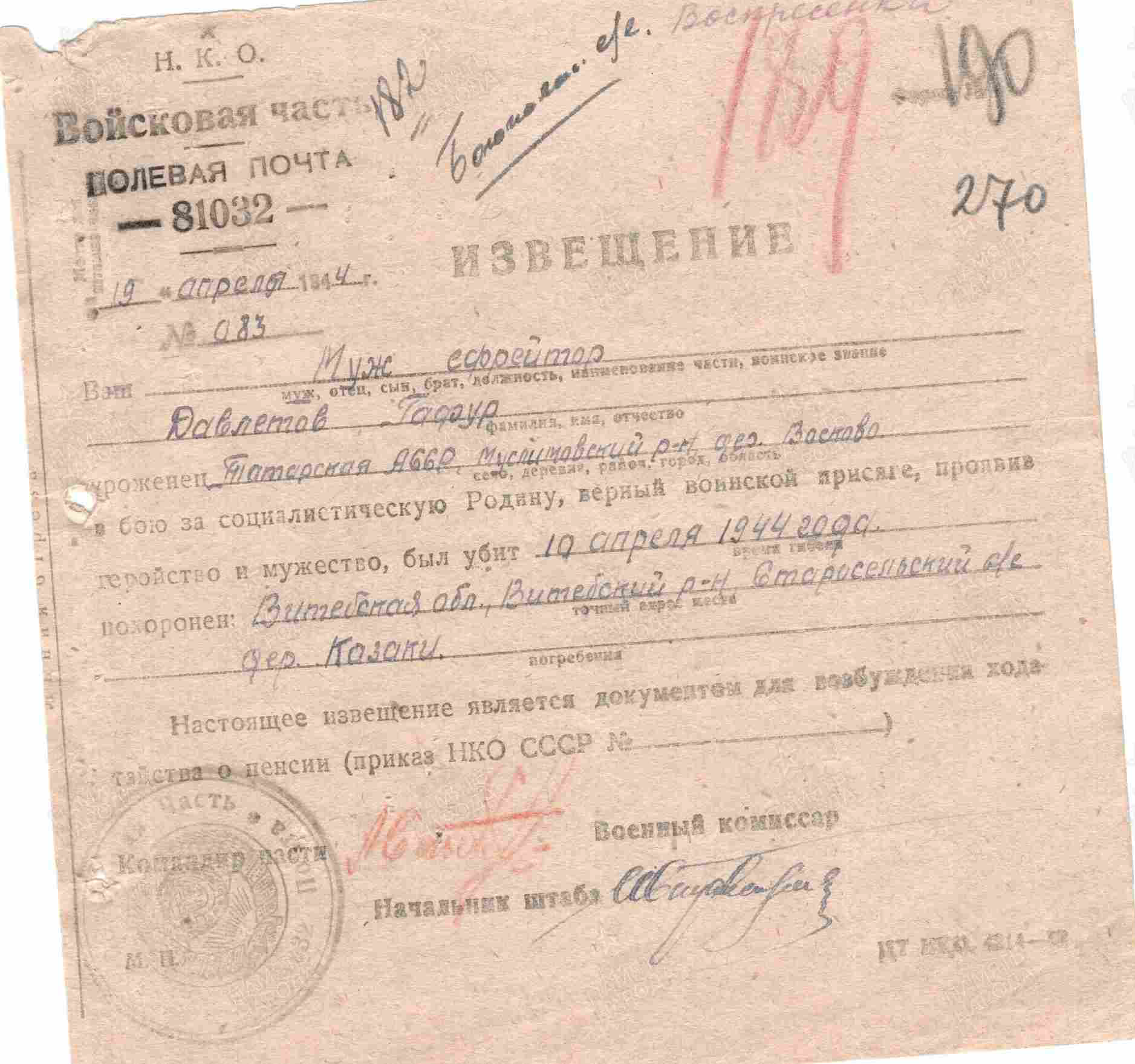 ![]() Валиуллин Гарифулла Валиуллович Родился 10.03.1922 г. в деревне Ургагары Алькеевского района ТАССР. 1941 году 17 июня он был призван в ряды Советской Армии. Первый бой принял в Смоленской области.Был рядовым стрелком под командованием 186 стрелкового полка. Освобождал города: Смоленск, Житомир, Полтава, Харьков.; Населённые пункты : Гурсе- Иваново, Заячья Гора. В конце 1943 года демобилизовался из-за тяжелого ранения. Был контужен. И вернулся в родную деревню. День Победы встретил дома, в кругу близких. Награждён: правительственные боевые награды, как «Орден Отечественной войны первой степени», медаль «За боевые заслуги», знак « Фронтовик 1941-1945 г.», «Медаль Жукова» , и юбилейные награды «30 лет победы в Великой Отечественной войне» «40 лет победы в Великой Отечественной войне» «50 лет победы в Великой Отечественной войне» «60 лет победы в Великой Отечественной войне». Умер Гарифулла Валиуллович в 2014 г. ![]() Сыров Николай Иванович Родился 10 мая 1925 г. в г. Бугульма Татарская АССР. Воевал под Ленинградом, был на восстановительных работах после блокады Ленинграда. Умер Николай Иванович 31 марта 1999 г. ![]() Казымов Василий Михайлович Казымов Василий Михайлович родился в 1899 г. в Молотовской области Ордженикидского района (Пермский край) был призван на войну с первых дней. Дома у него оставалась престарелая мать, супруга с тремя малолетними детьми, о которых он продолжал заботиться, находясь на фронте, о чем сохранились письма, в которых он передает «Боевой, пламенный привет» родным, пишет, что у него все хорошо, только комары «замучали», просит, чтобы почаще писали ему письма и присылали «фотокарточки и рисунки детишек». С особым трепетом и нежностью отзывается о своей престарелой матери, просит ей помогать. Из писем видно, что, даже находясь на фронте, он продолжал решать житейский вопросы, так, например, в одном письме упоминается о доставке дров в дом и пропитания. Письма хранятся в семье до сих пор. Казымов В.М.в званиистаршего сержанта участвовалв сражениях за Родину. Проявив геройство, был ранен в бою и погибот ран26 августа 1943 года. Всемье сохраненатакже похоронка с фронта. Казымов В.М. был похоронен в районе леса западнее 1 -1,2 км с. Беспаловка Змевского района Харьковской области.